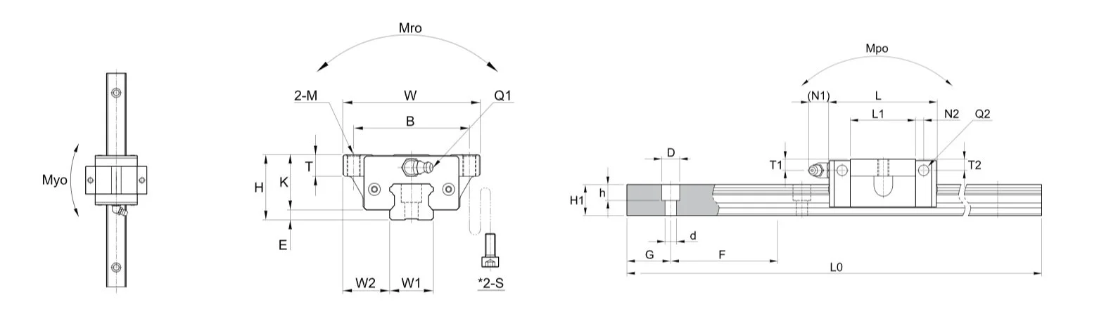 | B | M | *S | T1 | N1 | T2 | N2 | Q1 | *Q2 | d | D | h | C | Co | Mro | Mpo | Myo | Block (kg) | Rail (kg/m) | Rail (kg/m) | |||||||||||||||
