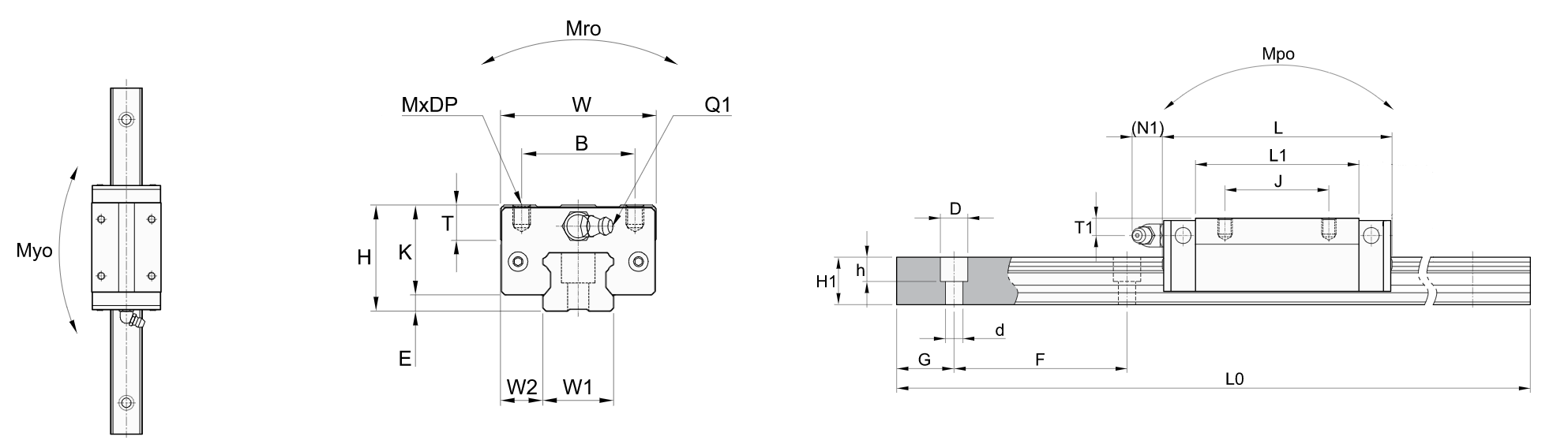 | H | W | L | E | Mounting tap hole | L1 | T±1 | K | Grease fitting | W1 | W2 | H1 | F | Bolt hole | G | Max length of rail LO | |||||||||||||||||||